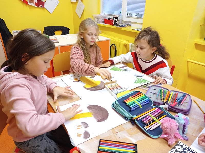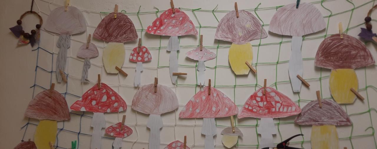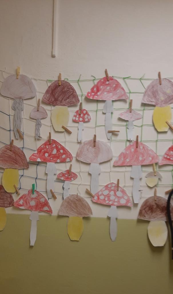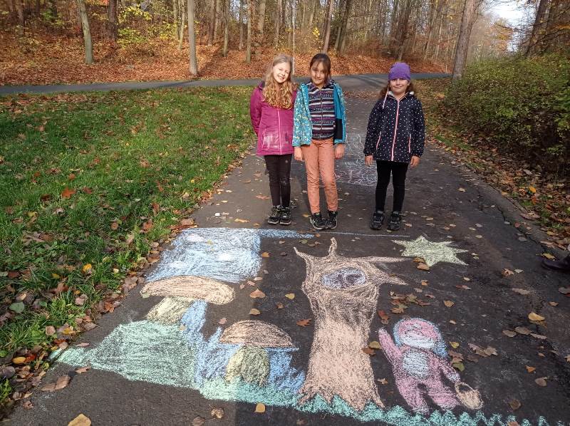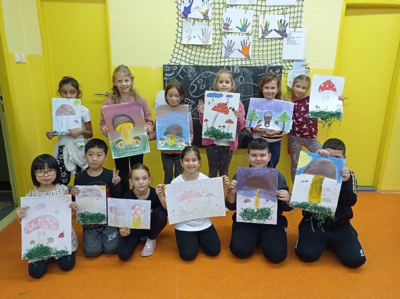 Se žáky jsme si popovídali o houbách jedlých i jedovatých, o houbaření a pokrmech z hub. Žáčci houby sbírali, kreslili křídou v přírodě, vystřihovali a lepili z papíru. Společně jsme si vyprávěli o ježkovi, kterého jsme viděli v přírodě. Ve třídě ježka šikovně vytvořili ze čtvrtky a nalepili mu bodlinky z kousků suché trávy.