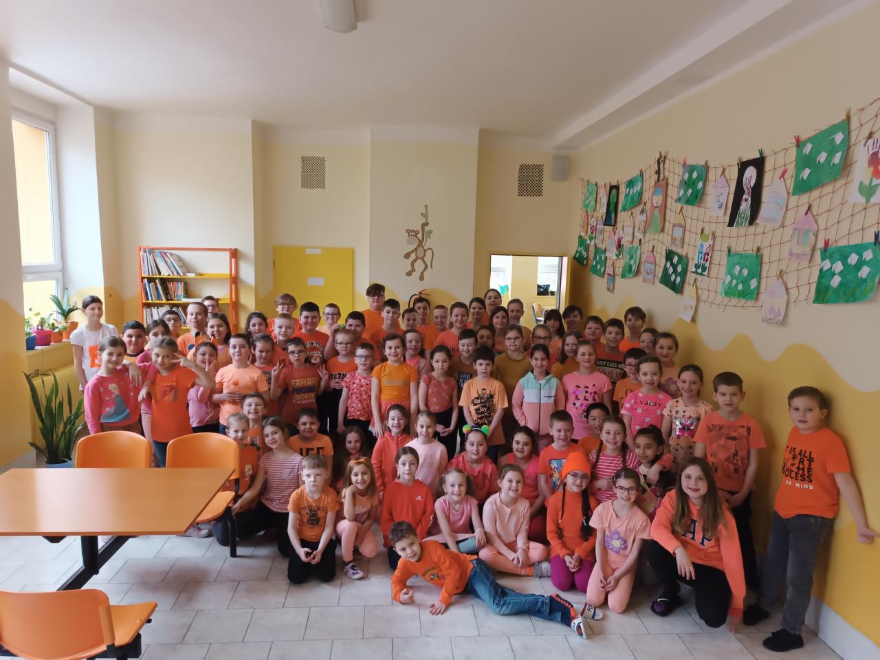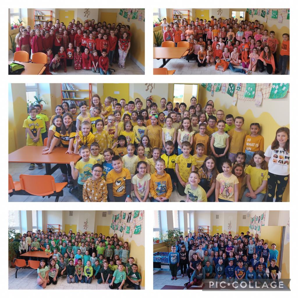 Úkolem dětí bylo oblékat se postupně do oblečení v barvách duhy, tak jak jdou za sebou. Měli jsme tedy červené pondělí, oranžové úterý, žlutou středu, zelený čtvrtek a modrý pátek. Účast žáků na prvním i druhém stupni byla velice hojná, jednotlivé třídy se předháněly v počtu správně oblečených jedinců. Děkujeme všem žákům, jejich rodičům a zaměstnancům školy, že se aktivně zapojují do tematických dnů a zlepšují a oživují tak klima na škole.