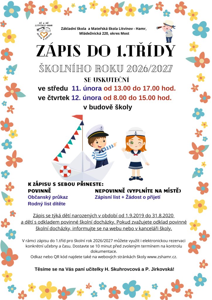 Zápis dětí do 1. třídy školního roku 2026/2027 se uskuteční ve středu 11. února 2026 od 13:00 do 17:00 hod. a ve čtvrtek 12. února 2026 od 8:00 do 15:00 hod. v budově ZŠ Litvínov-Hamr.